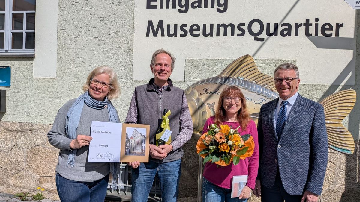 Mit Jutta Baumgartl aus Landshut konnte Bürgermeister Franz Stahl heute Vormittag den bereits 250.000. Besucher des Tirschenreuther MuseumsQuartiers (MQ) begrüßen. „So etwas liest man sonst nur in der Zeitung – unglaublich, dass ich nun eine Jubiläumsbesucherin bin“, so die ehemalige Beamtin der Deutschen Rentenversicherung, die den Besuch des MQ erst am Morgen spontan mit ihrem Ehemann Roland geplant hatte. Roland Baumgartl ist Lehrer am Landshuter Gymnasium – und wie seine Ehefrau bekennender Museumsfan. Die Freude war deshalb umso größer, als Bürgermeister Franz Stahl und Museums-Mitarbeiterin Ronja Storch den beiden nicht nur einen Blumenstrauß und eine Flasche Wein überreichten, sondern auch eine „goldene“ Eintrittskarte. Mit dieser ist das Ehepaar zum lebenslangen freien Eintritt in das MQ berechtigt. Jutta und Roland Baumgartl haben an Ort und Stelle – wieder ganz spontan – bereits ihren nächsten Tirschenreuther Muse-umsbesuch geplant. Denn die dort am 30. Mai beginnende Ausstellung des amerikanischen Pop-Art-Künstlers James Rizzi wollen sie sich auf keinen Fall entgehen lassen.
